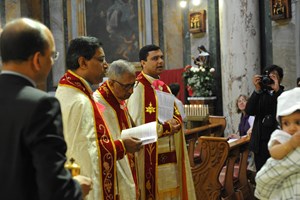 Lunedì 24 maggio 2010, dopo aver informato e ottenuto l’autorizzazione S. Em. Card. Angelo Comastri, si è svolto nella nostra Parrocchia il rito dell’iniziazione cristiana di Dominic Paul, un bellissimo bambino indiano nato a Raleigh – USA il 3 ottobre dell’anno scorso. La celebrazione è si è svolta nel rito Siro Malabarese ed è stata presieduta da S. Ecc. dall’ Mons. Joseph Powathil, arcivescovo emerito di Changanacherry (India).