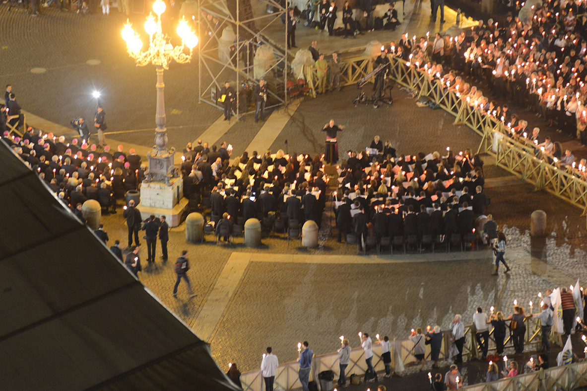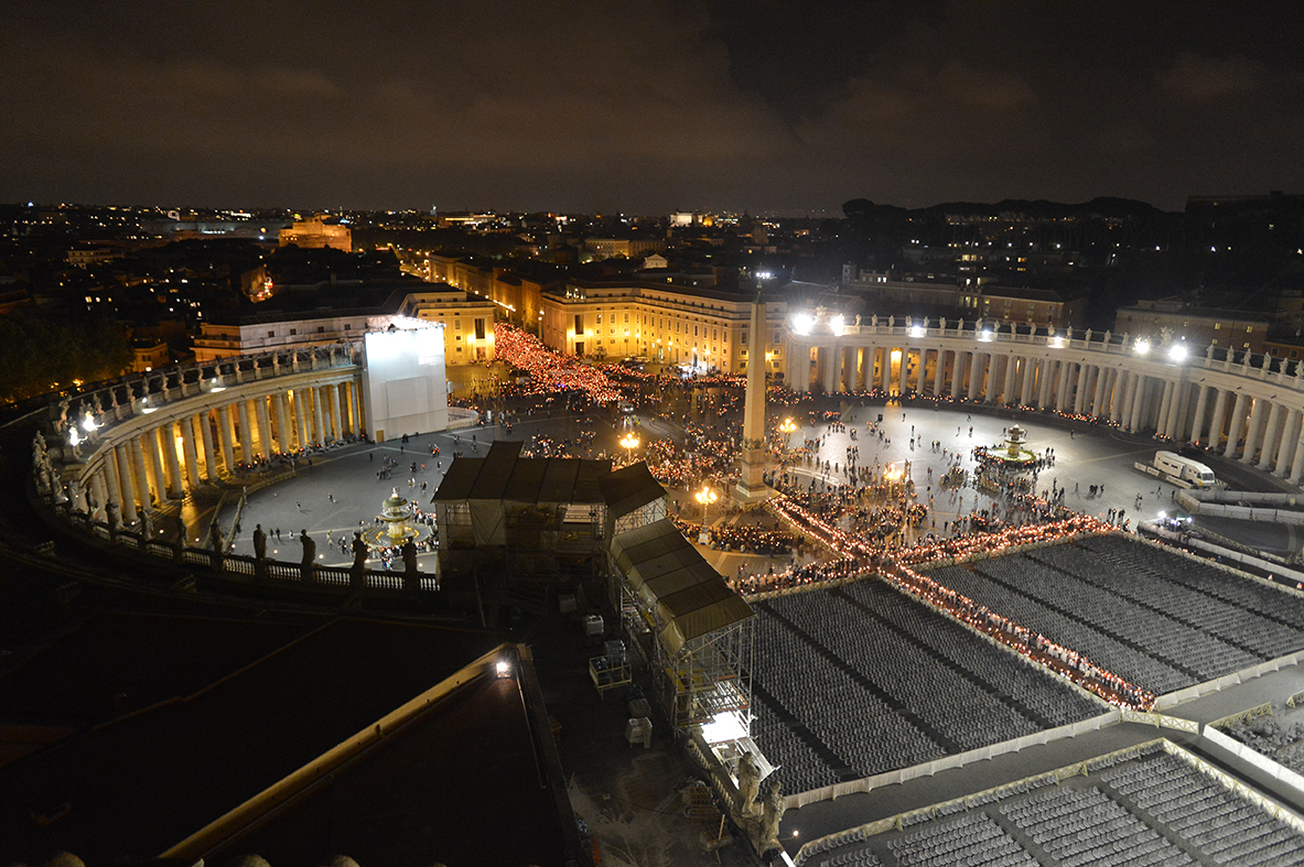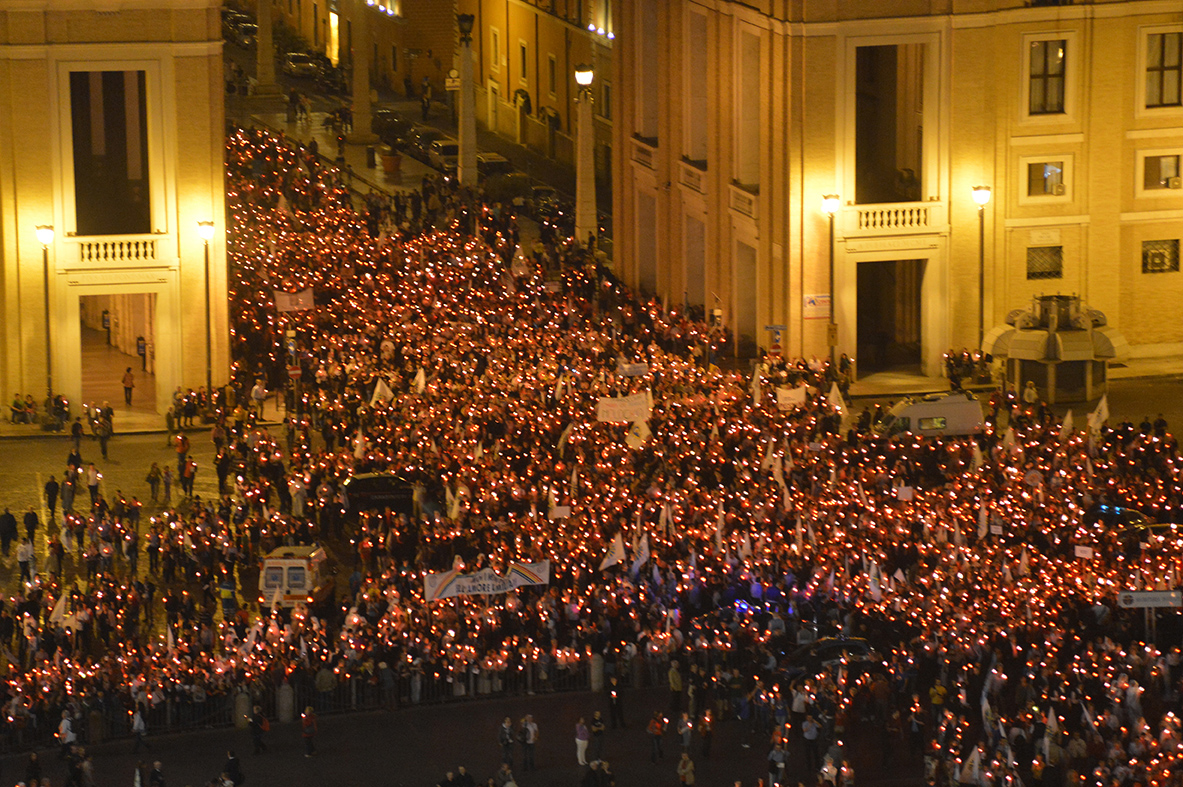 Riportiamo alcuni scatti fotografici del Parroco P. Bruno Silvestrini e del signor Marco Andreozzi effettuati dalla terrazza della terza loggia della Segreteria di Stato per immortalare la fiaccolata dell’11 ottobre 2012 in ricordo di quella che fecero i fedeli, 50 anni fa in occasione del Concilio Vaticano II. Riportiamo un piccolo articolo tratto da La Redazione di Vatican Insider, 12 ottobre 2012. “Come cinquanta anni fa, quando dal balcone del Palazzo apostolico Giovanni XXIII fece lo storico discorso "alla luna", questa sera giovani, uomini e donne sono in marcia verso San Pietro hanno atteso in silenzio e gioia le parole del Papa. Papa Ratzinger ha impartito la sua benedizione ai circa quarantamila pellegrini che hanno partecipato alla fiaccolata organizzata dall'Azione Cattolica a 50 anni dall'apertura del Concilio. L'iniziativa ''La Chiesa bella del Concilio'', promossa in collaborazione dall'Azione Cattolica con la Diocesi di Roma ha ricordato l'identica fiaccolata organizzata 50 anni fa, al termine della quale papa Giovanni XXIII si affacciò dalla finestra del suo studio per pronunciare il famoso ''discorso della luna''. La fiaccolata è partita alle ore 19.30 da Castel Sant'Angelo ed ha raggiunto San Pietro dove, dopo interventi, testimonianze e momenti di preghiera, alle ore 21 il saluto e la benedizione da parte di Benedetto XVI che ringraziato i presenti facendo proprie le parole del suo predecessore Giovanni XXIII. "In questi 50 anni abbiamo imparato ed esperito che il peccato originale esiste e si traduce in peccati personali, che possono divenire strutture di peccato, visto che nel campo del Signore c'è anche la zizzania, che nella rete di Pietro ci sono anche pesci cattivi, che la fragilità umana è presente anche nella Chiesa, che la nave della Chiesa sta navigando con vento contrario, con minacce contrarie. E qualche volte abbiamo pensato 'il Signore dorme e ci ha dimenticato'. Ma anche abbiamo fatto esperienza della presenza del Signore, della sua bontà della sua presenza: il fuoco di Cristo non è divoratore né distruttivo, è un fuoco silenzioso una piccola fiamma di bontà: il Signore non ci dimentica, il suo modo è umile, il Signore è presente, dà calore ai cuori, crea carismi di bontà e carità che illuminano il mondo e sono per noi garanzia della bontà di Dio. Sì, Cristo vive con noi e possiamo essere felici anche oggi. Alla fine oso fare mie le parole indimenticabili di papa Giovanni: 'Andate a casa date una carezza ai bambini e dite che è la carezza del Papa'".