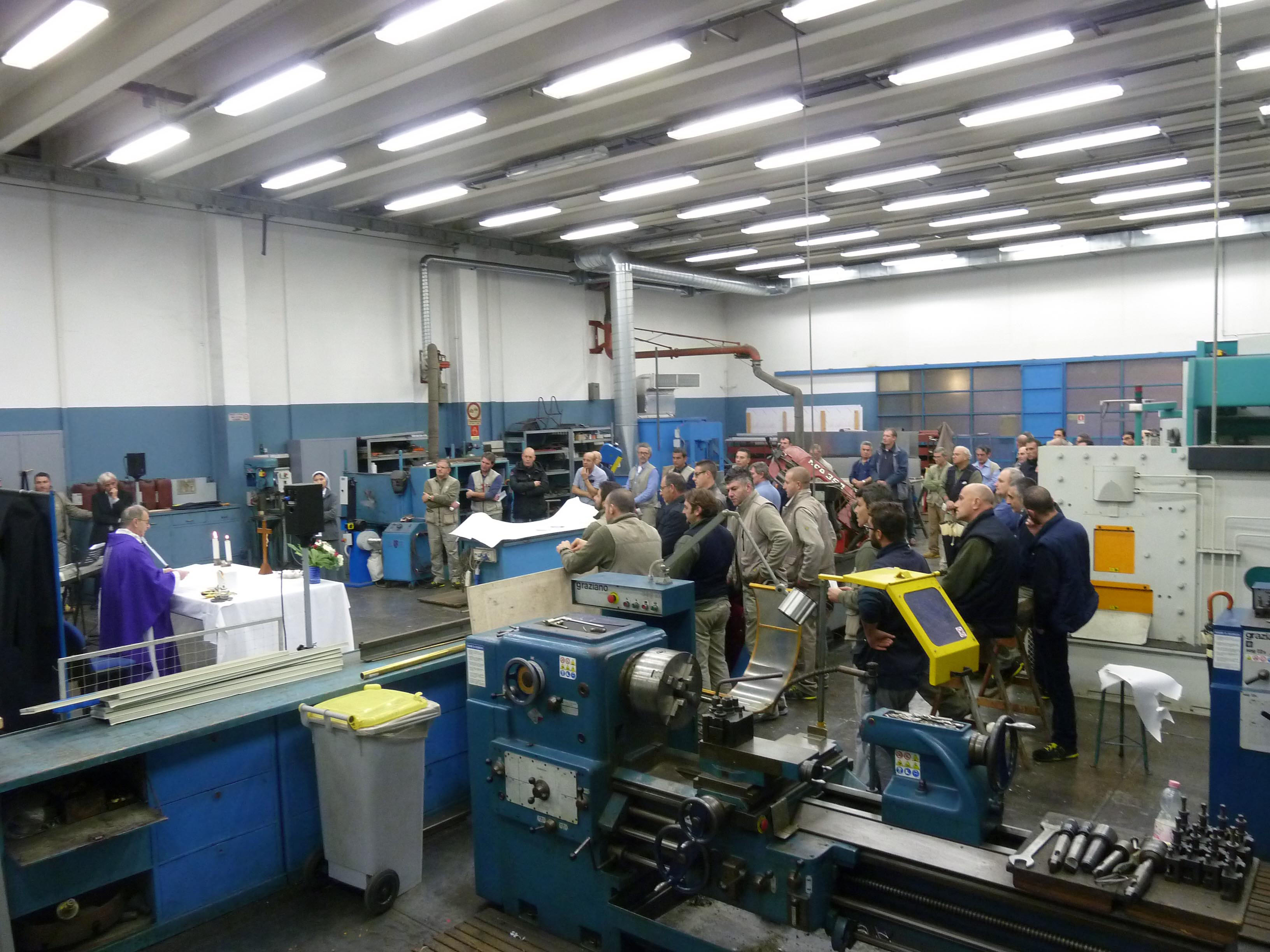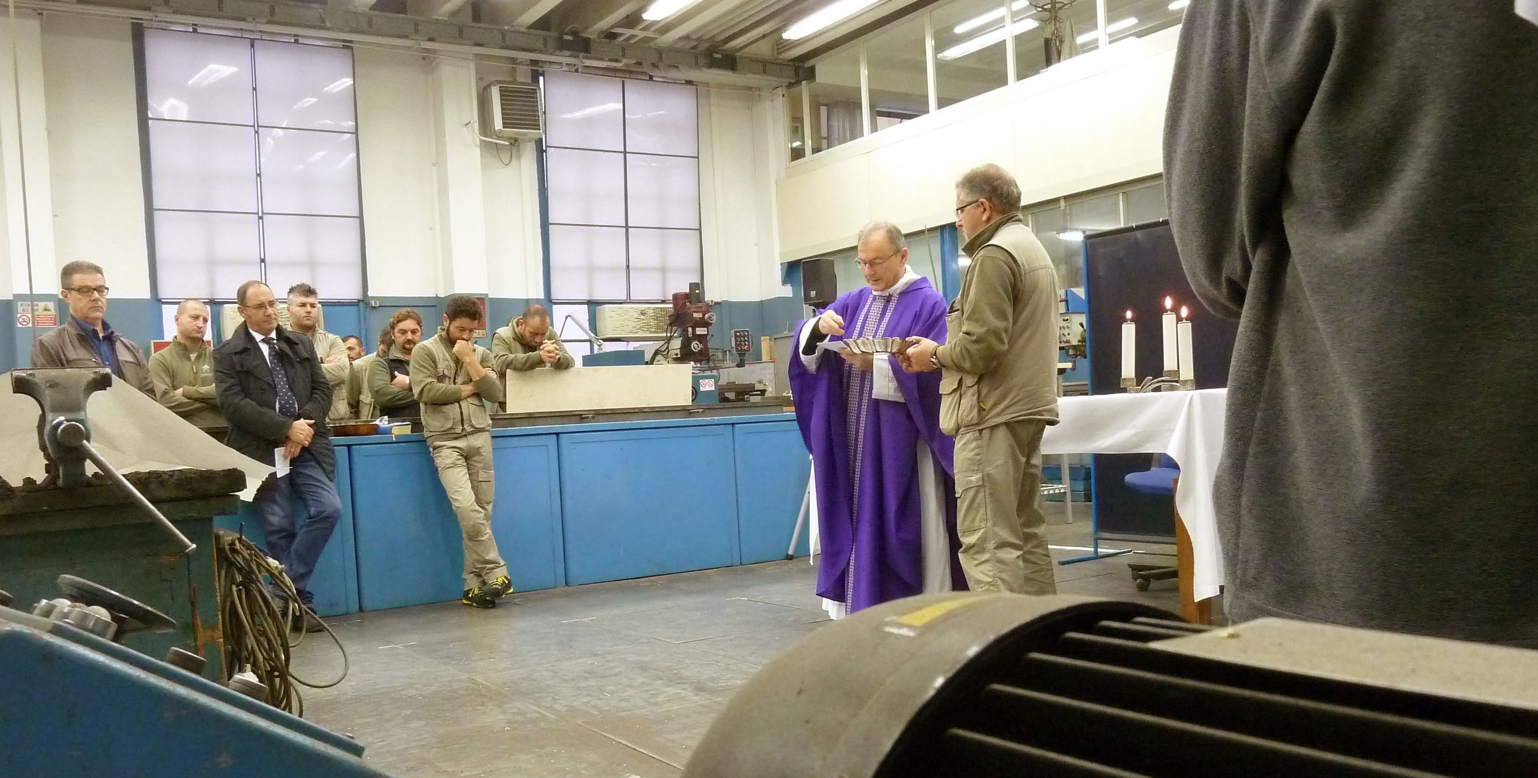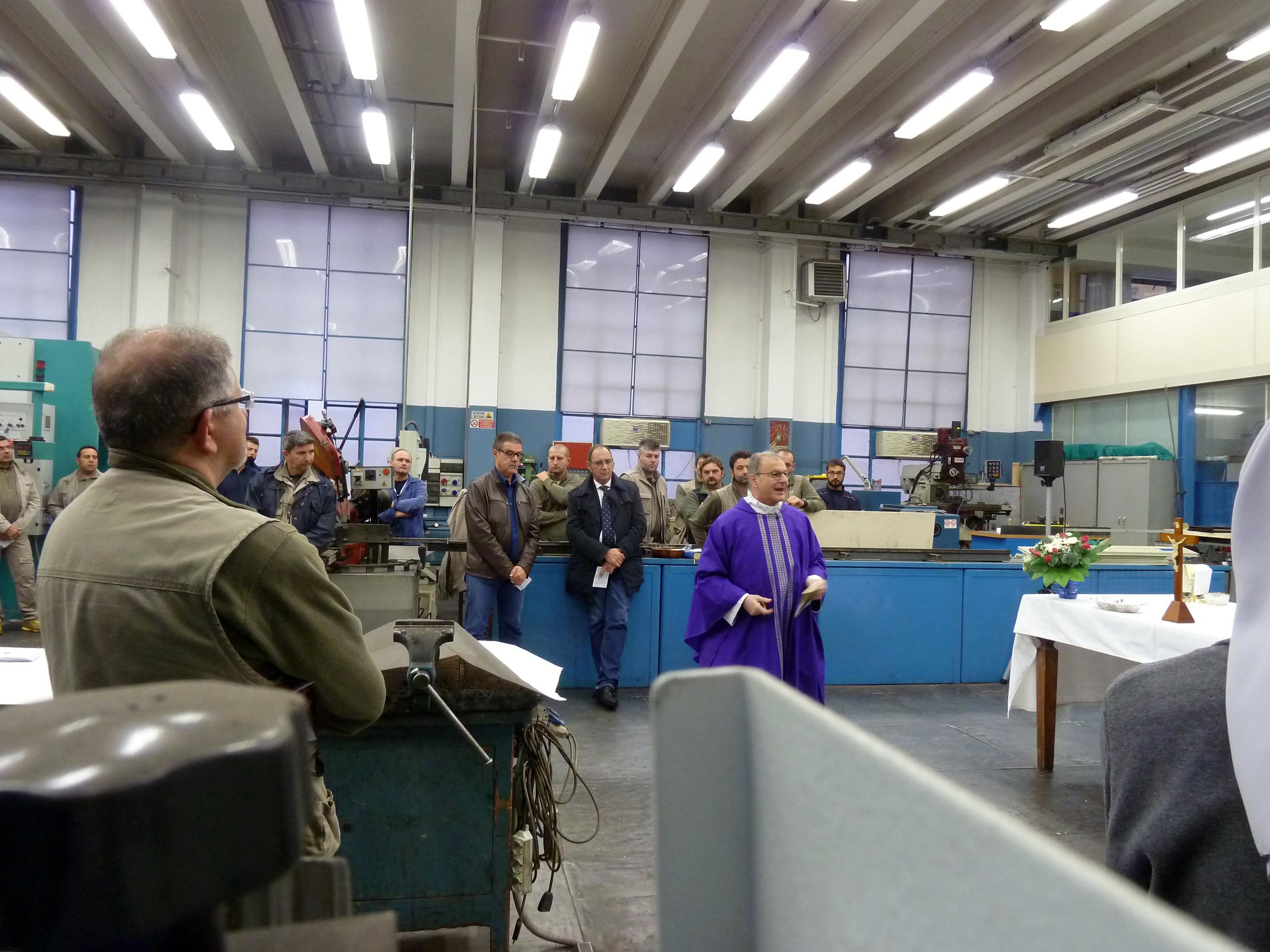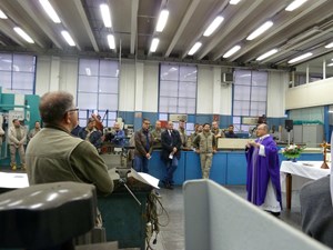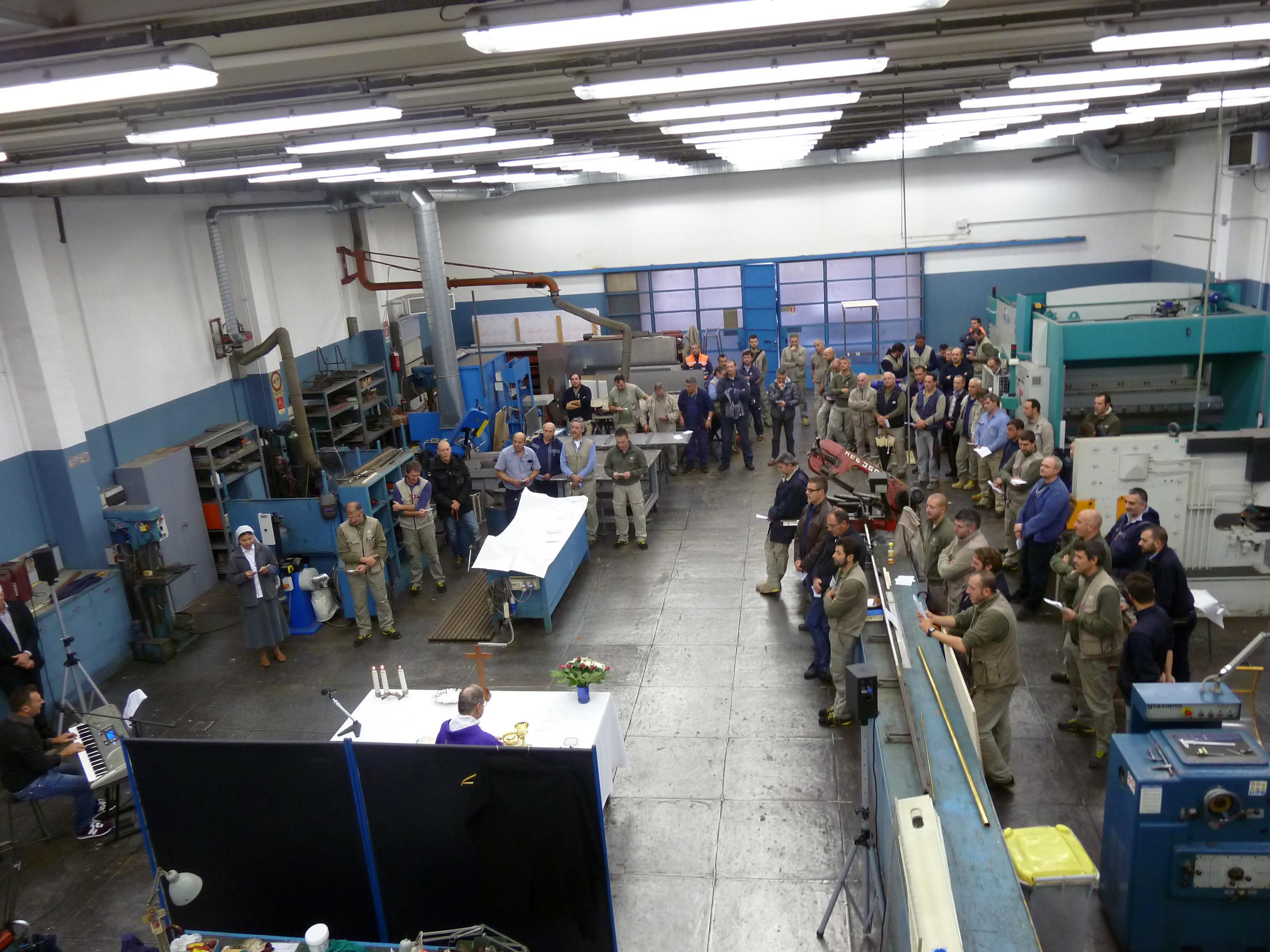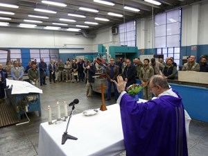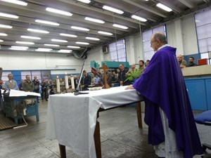 Venerdì 7 novembre 2014, alle ore 8 tutti gli operai e i responsabili della zona industriale del Vaticano si sono ritrovati nel grande magazzino dei meccanici per partecipare alla Santa Messa del primo venerdì del mese. La celebrazione, presieduta dal Parroco padre Bruno Silvestrini, è stata preceduta dalla prova dei canti, la preparazione della mensa e la compilazione della lista delle persone care defunte. Al termine dell’omelia Padre Bruno ha letto i nomi dei genitori, parenti, amici e colleghi defunti. Un particolare ricordo è stato innalzato al Signore per tutti le persone che hanno servito e amato la Città del Vaticano.