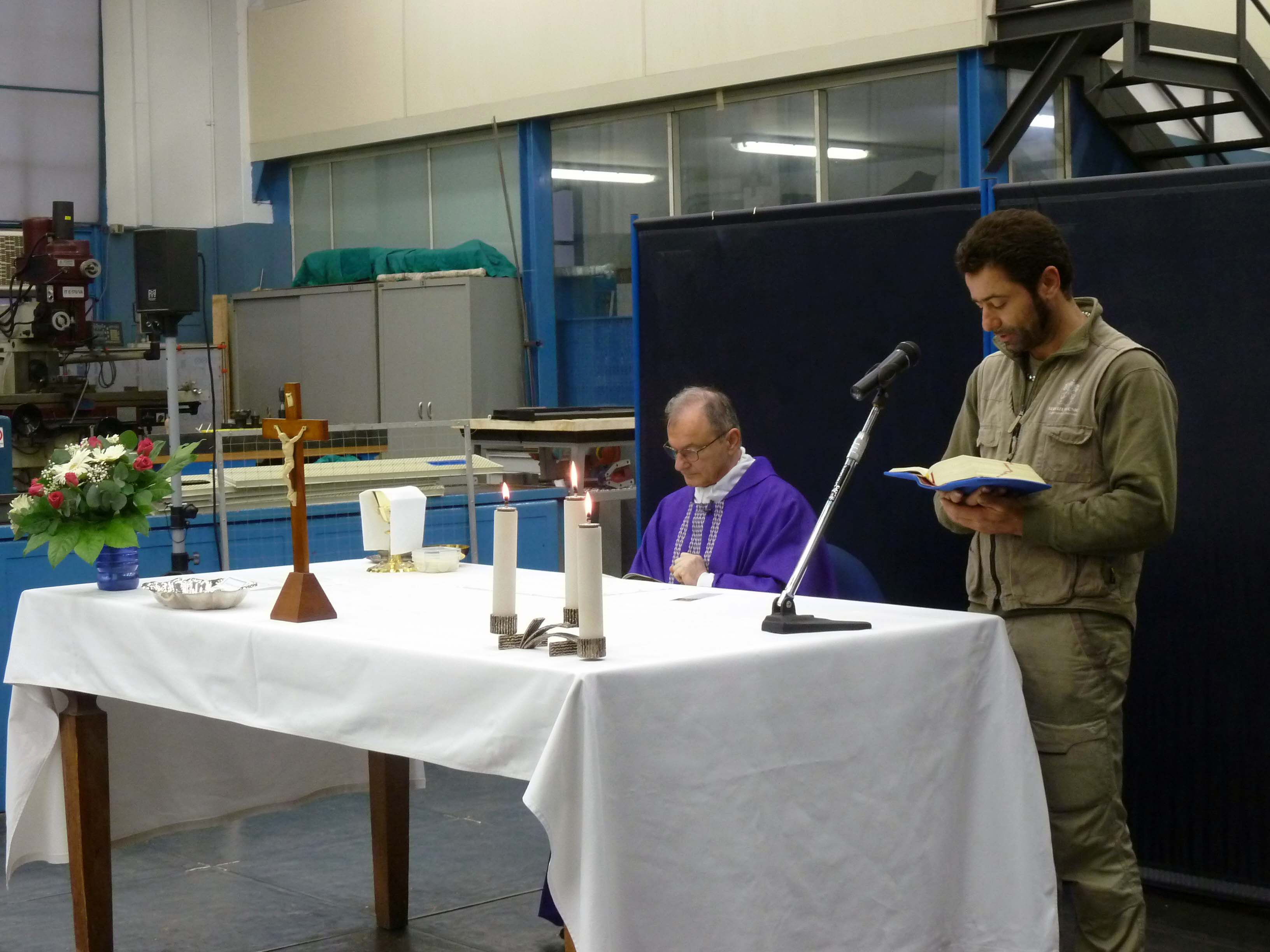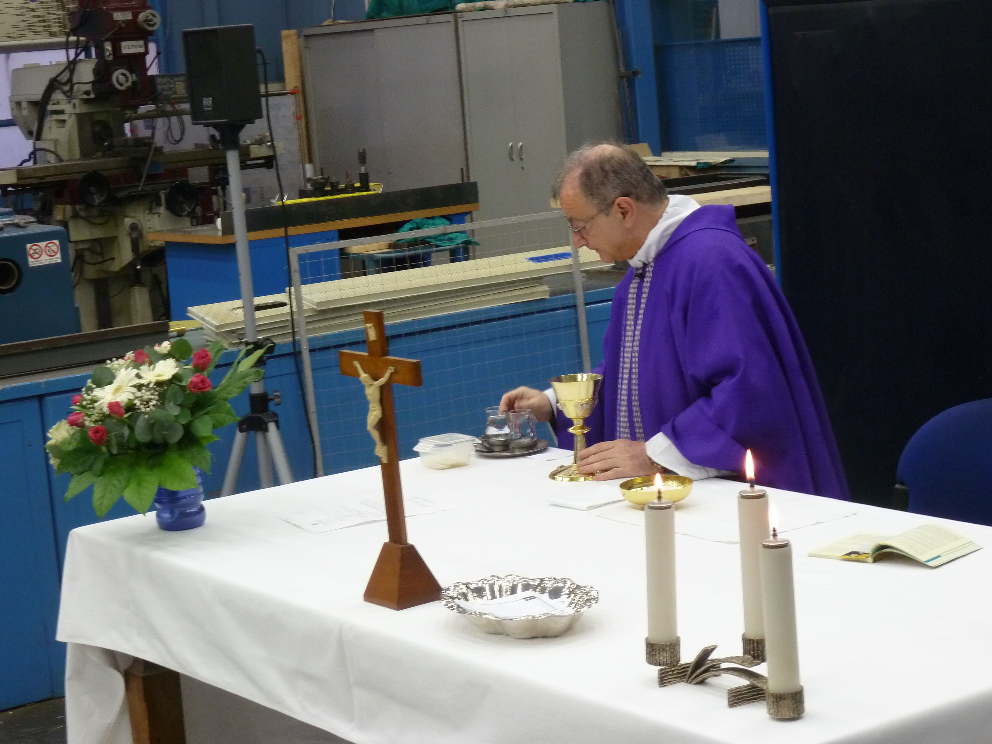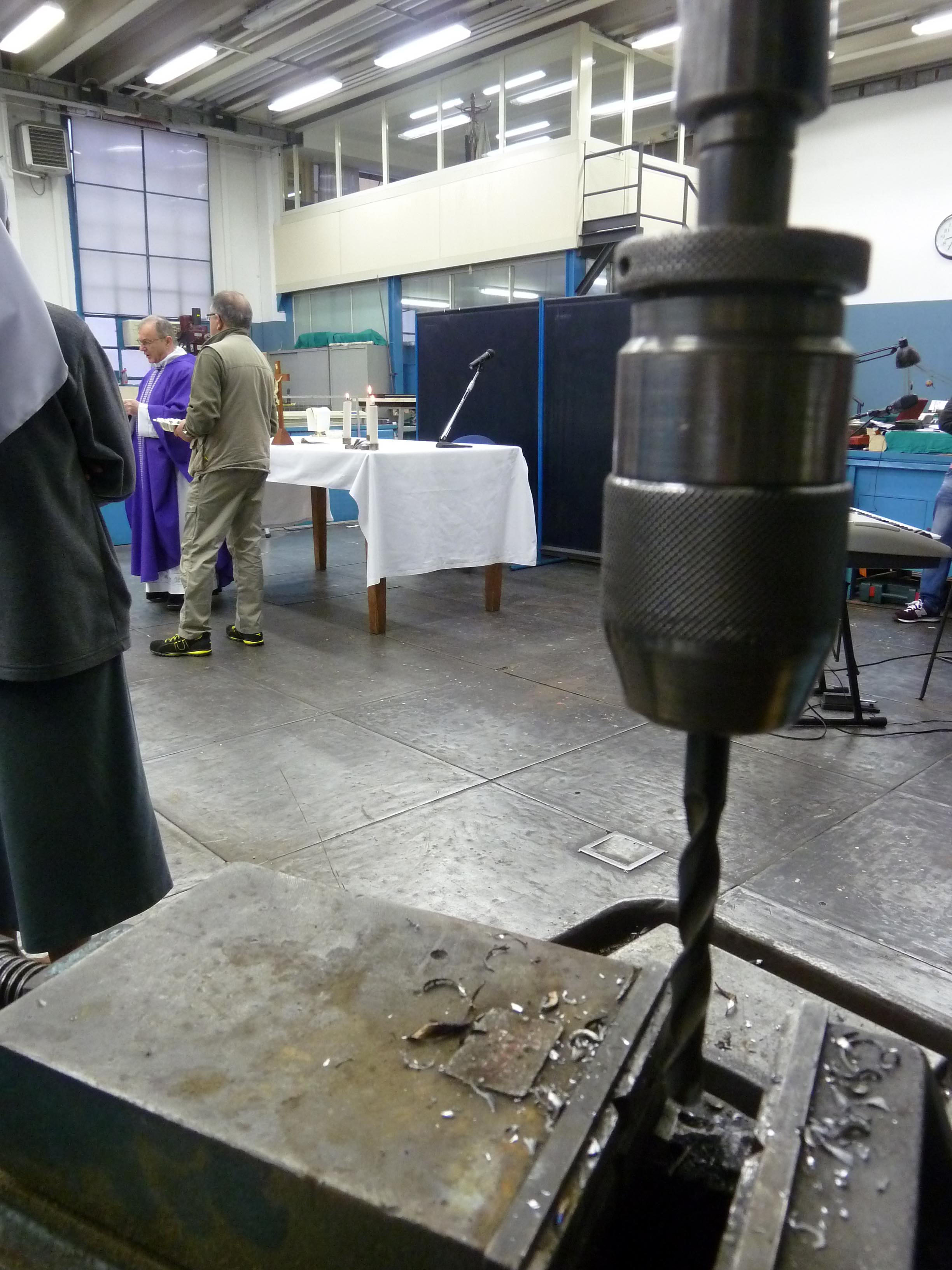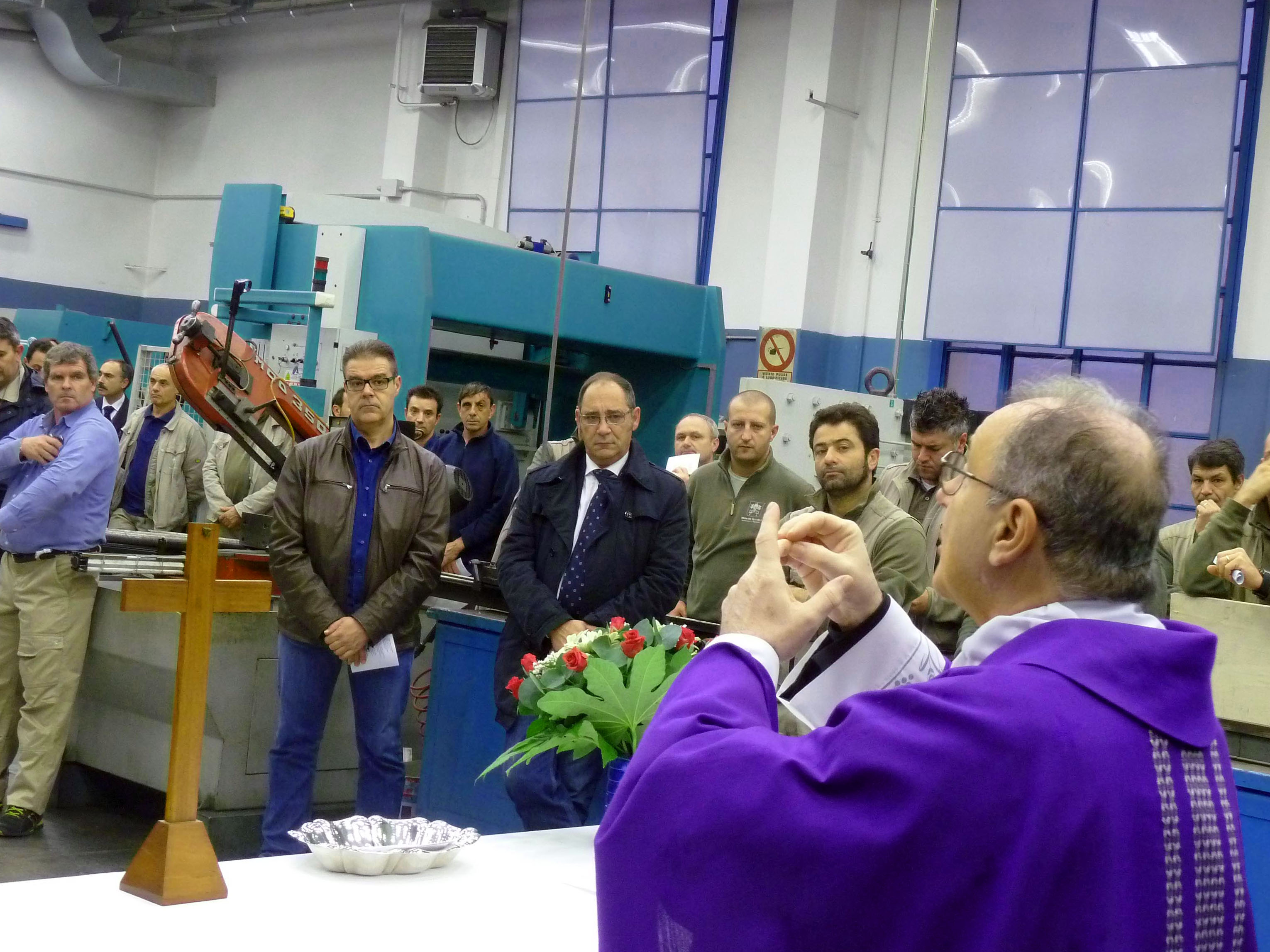 Venerdì 7 novembre 2014, alle ore 8 tutti gli operai e i responsabili della zona industriale del Vaticano si sono ritrovati nel grande magazzino dei meccanici per partecipare alla Santa Messa del primo venerdì del mese. La celebrazione, presieduta dal Parroco padre Bruno Silvestrini, è stata preceduta dalla prova dei canti, la preparazione della mensa e la compilazione della lista delle persone care defunte. Al termine dell’omelia Padre Bruno ha letto i nomi dei genitori, parenti, amici e colleghi defunti. Un particolare ricordo è stato innalzato al Signore per tutti le persone che hanno servito e amato la Città del Vaticano.