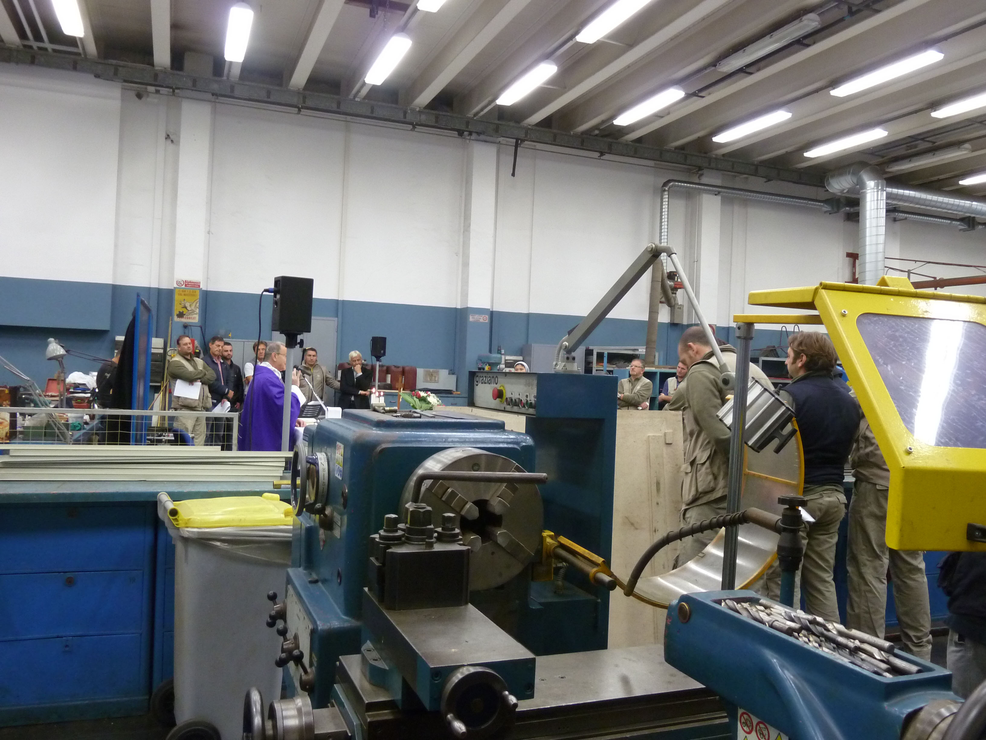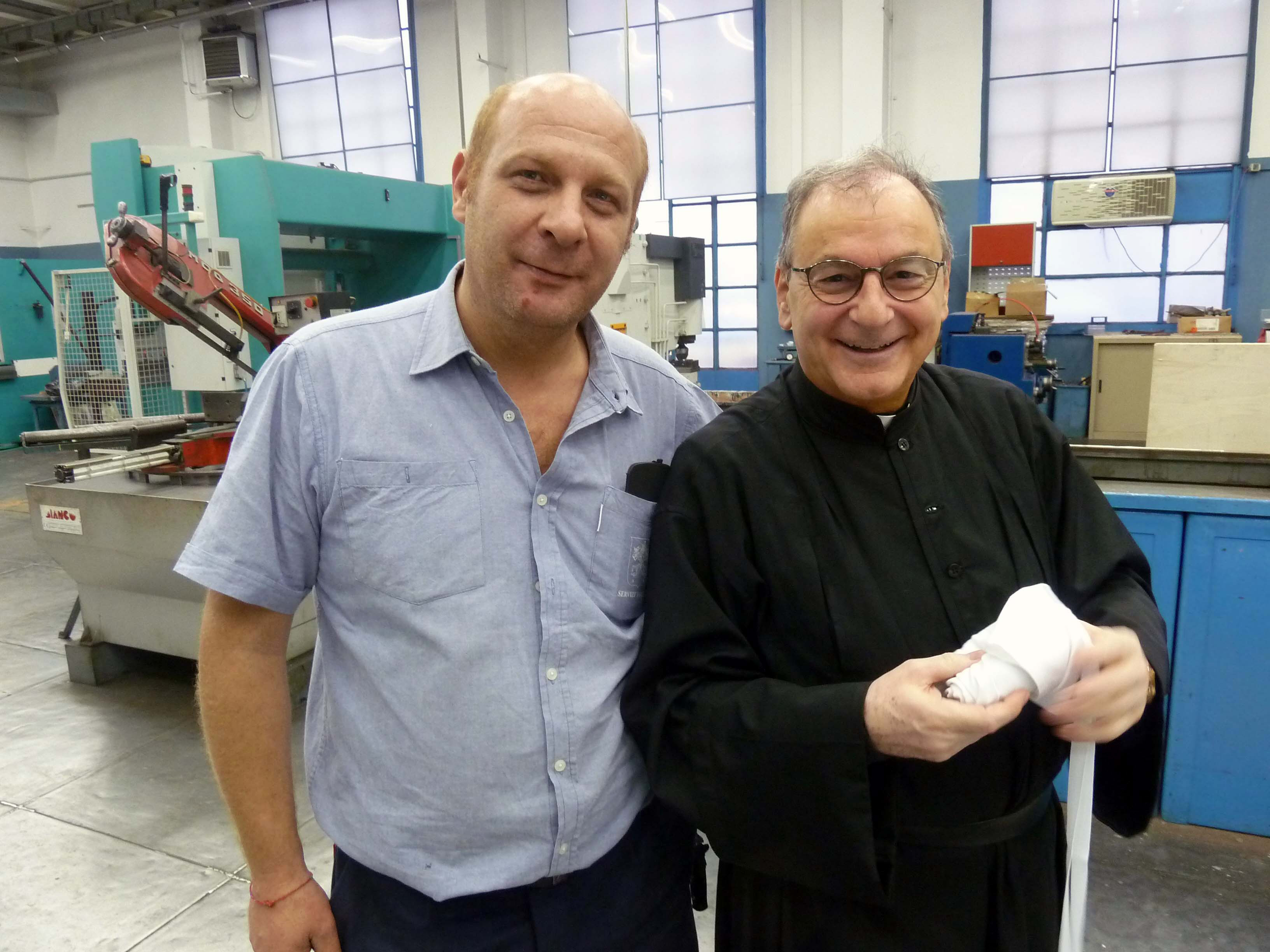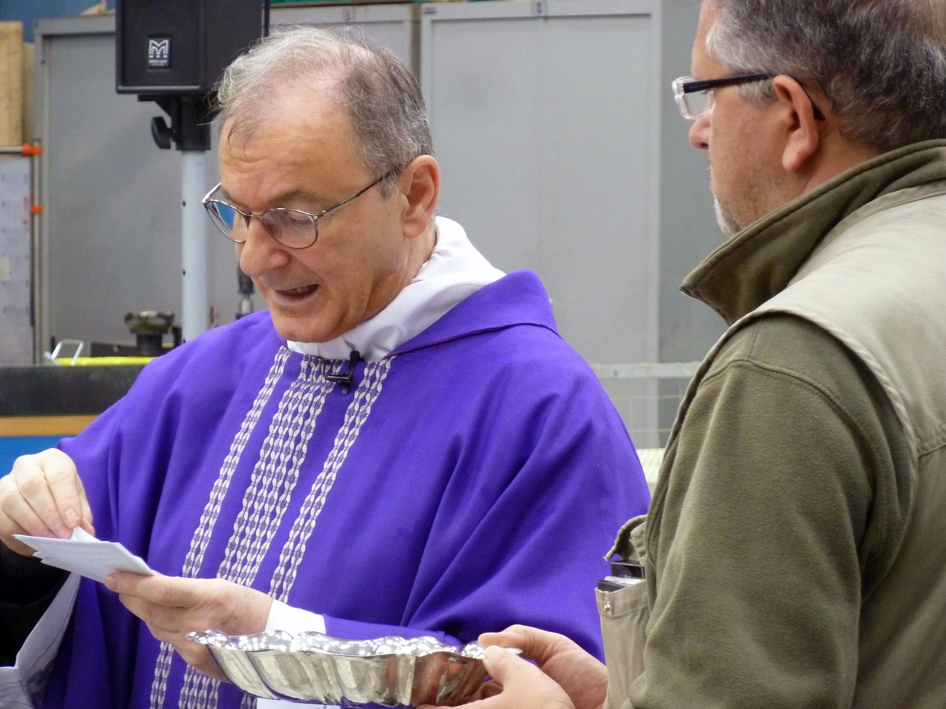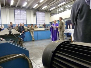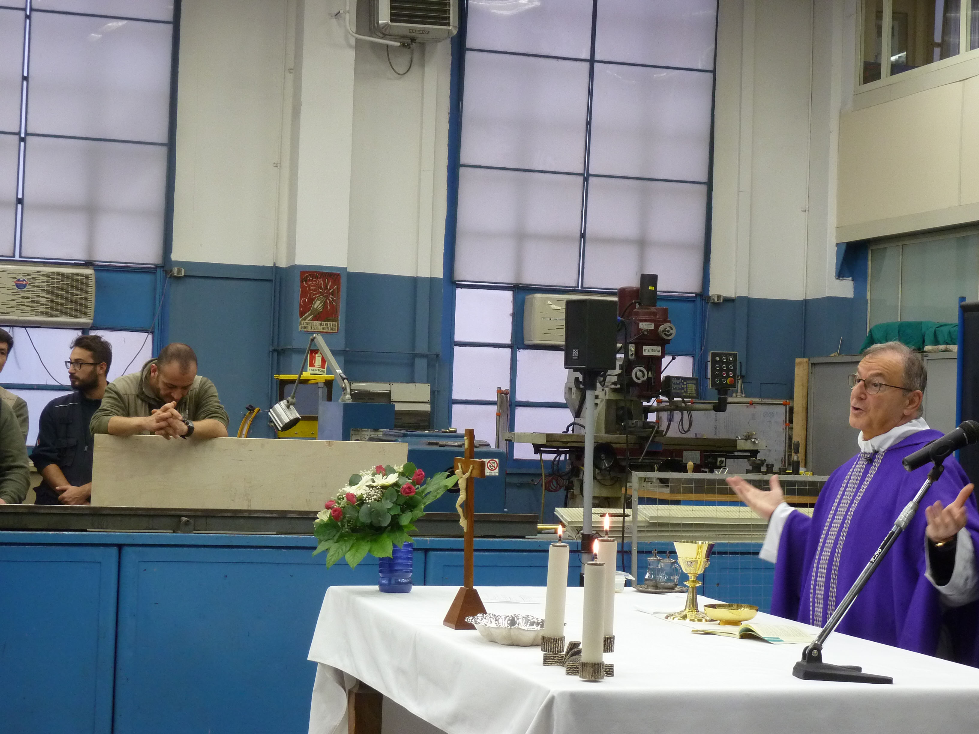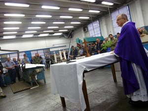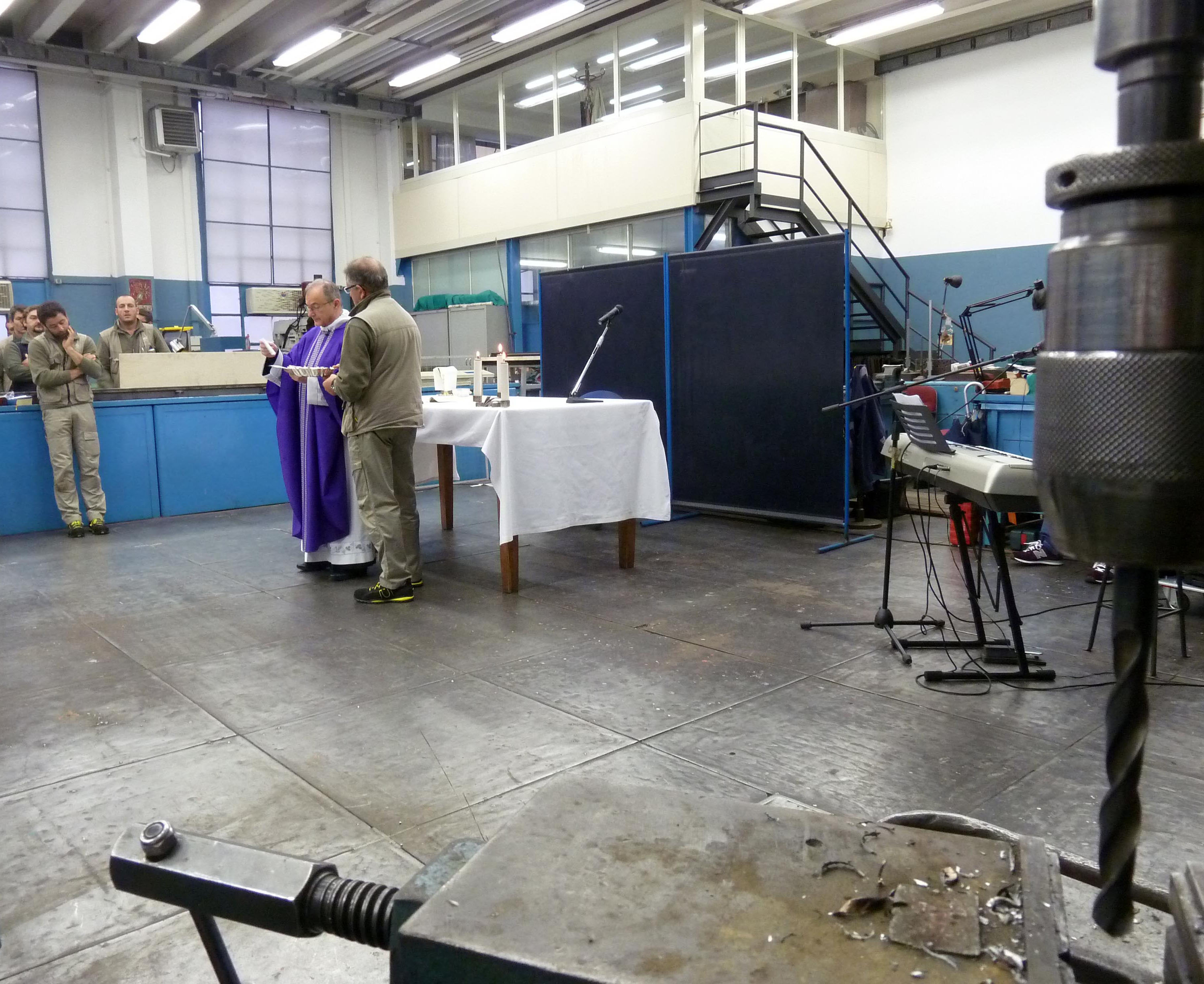 Venerdì 7 novembre 2014, alle ore 8 tutti gli operai e i responsabili della zona industriale del Vaticano si sono ritrovati nel grande magazzino dei meccanici per partecipare alla Santa Messa del primo venerdì del mese. La celebrazione, presieduta dal Parroco padre Bruno Silvestrini, è stata preceduta dalla prova dei canti, la preparazione della mensa e la compilazione della lista delle persone care defunte. Al termine dell’omelia Padre Bruno ha letto i nomi dei genitori, parenti, amici e colleghi defunti. Un particolare ricordo è stato innalzato al Signore per tutti le persone che hanno servito e amato la Città del Vaticano.